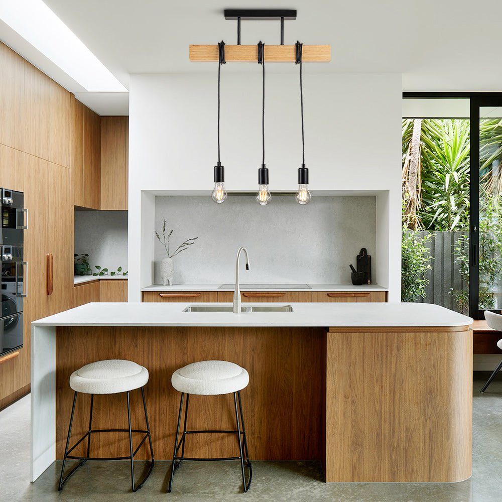 Podnieś swój przestrzeń dzięki rustykalnemu urokowi i nowoczesnemu, przemysłowemu stylowi naszej półplafonowej lampy wiszącej nad wyspę z 3 światłami w matowej czerni i drewnie. Wykonana z centralnym drewnianym korpusem i trzema smukłymi czarnymi oprawkami, ta lampa emanuje naturalnym ciepłem i współczesną elegancją. Doświadcz unikalnych i urzekających efektów świetlnych, które tworzą atmosferę w każdym pomieszczeniu Twojego domu. Idealna do wysp kuchennych i jadalni, ta lampa wisząca oferuje ukierunkowane oświetlenie zadaniowe, jednocześnie podnosząc funkcjonalność i styl. Niezależnie czy w sypialni, domowym biurze czy pokoju rekreacyjnym, ukierunkowane światło uzupełnia zadania akcentujące, a drewniane akcenty dodają ciepła i charakteru przestrzeni.
