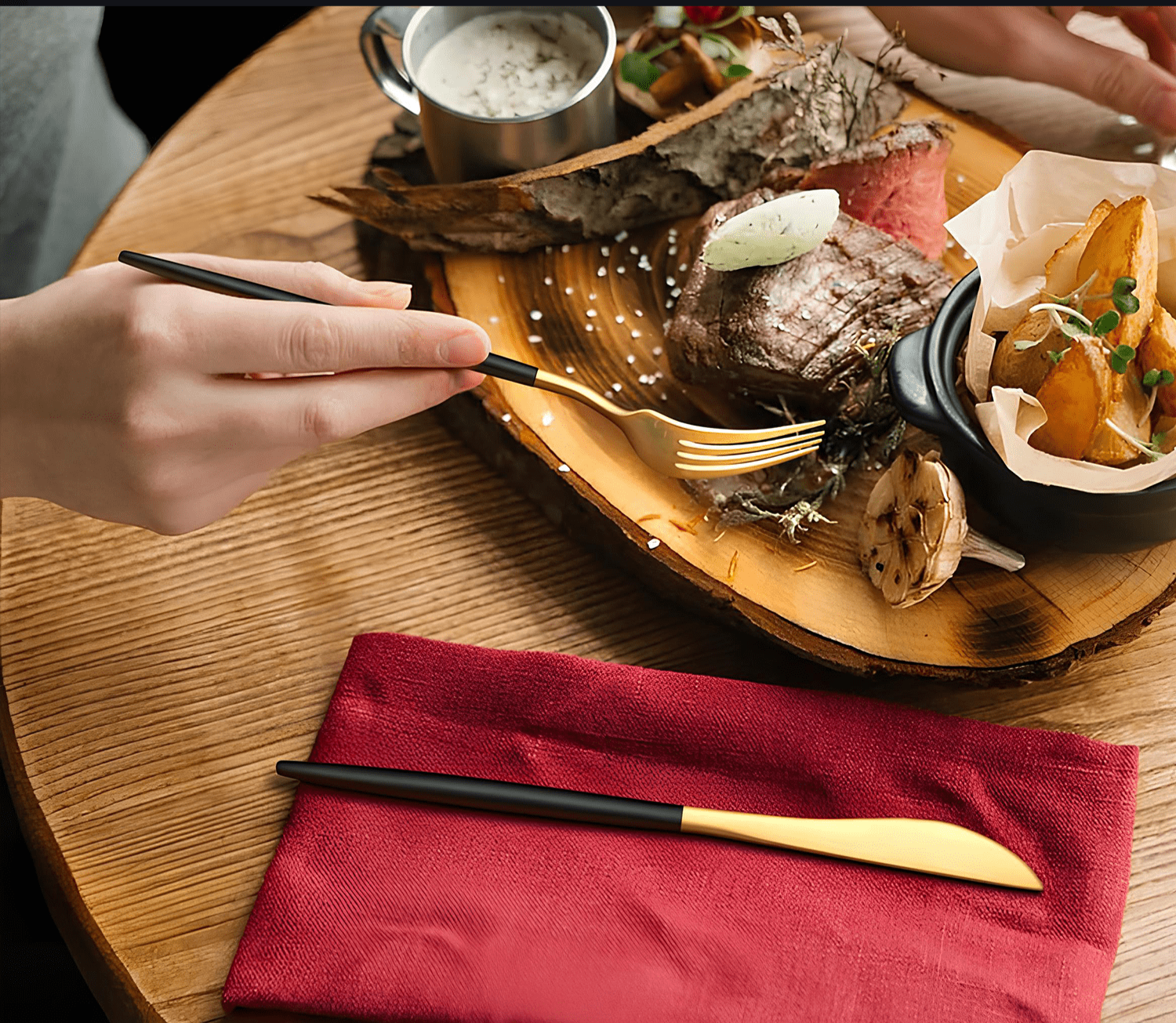 De RoyalServe - Zwart Gouden Bestekset voor Vier is veel meer dan alleen een bestekset; het is een culinaire ervaring. Stel u een prachtig gedekte tafel voor, een heerlijke maaltijd gedeeld met goede vrienden, en bestek dat direct de aandacht trekt door zijn verfijnde uitstraling. Met deze elegante set van 20 stuks brengt u een stukje luxe in huis, zoals te vinden in Michelin-sterrenrestaurants.
